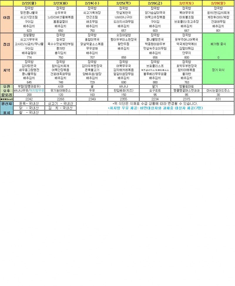 2월 4주 식단표