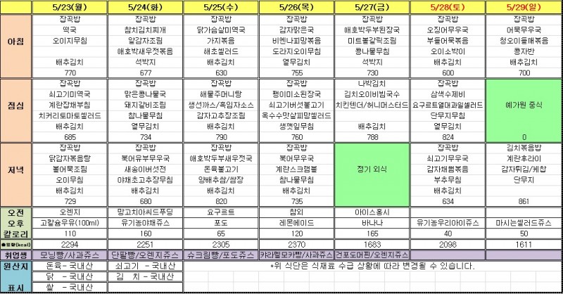 5월 4주 식단표