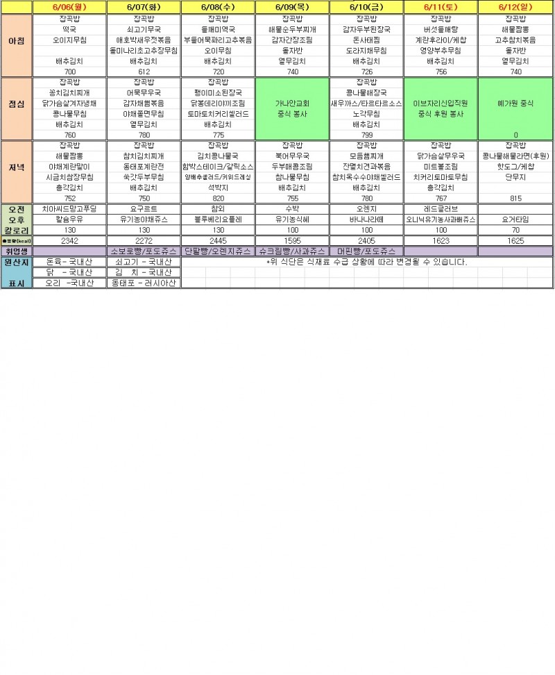 6월 2주 식단표