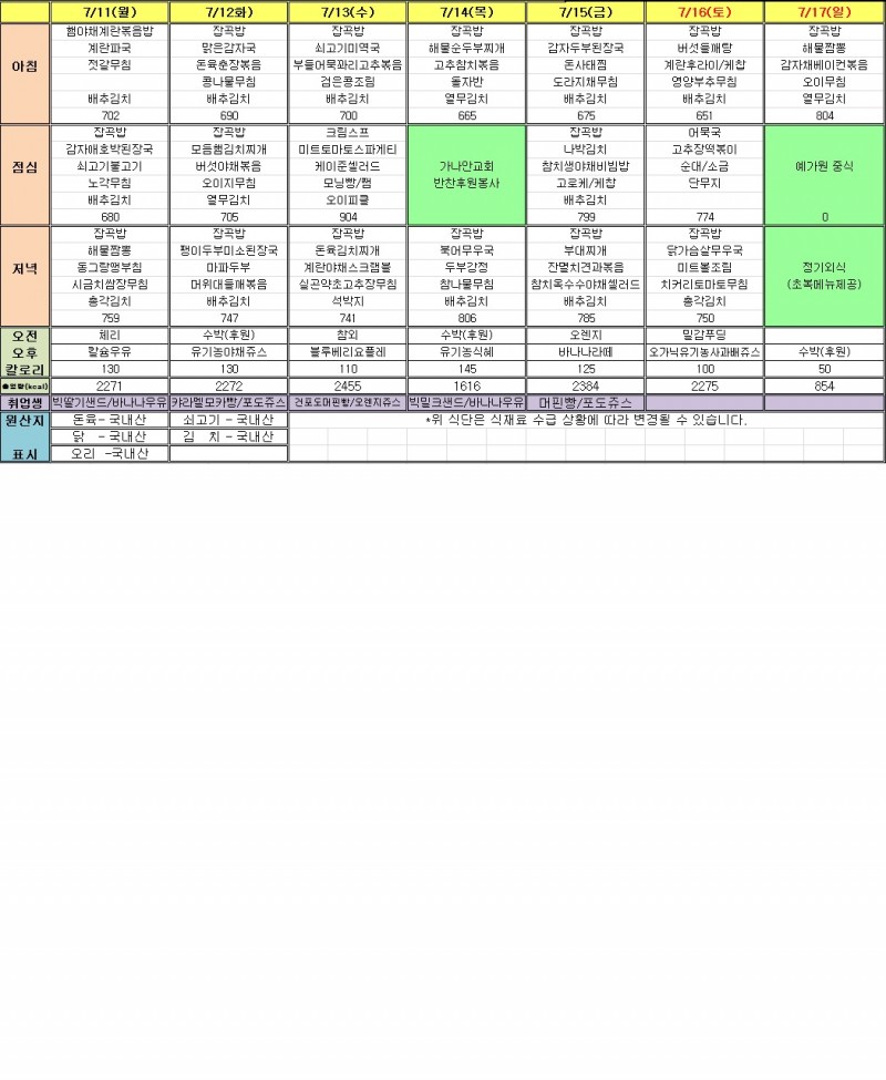 7월 1주 식단표