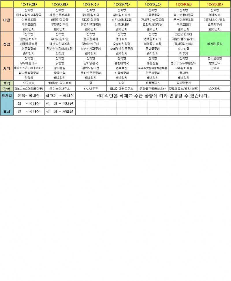 12월 마지막주 식단표