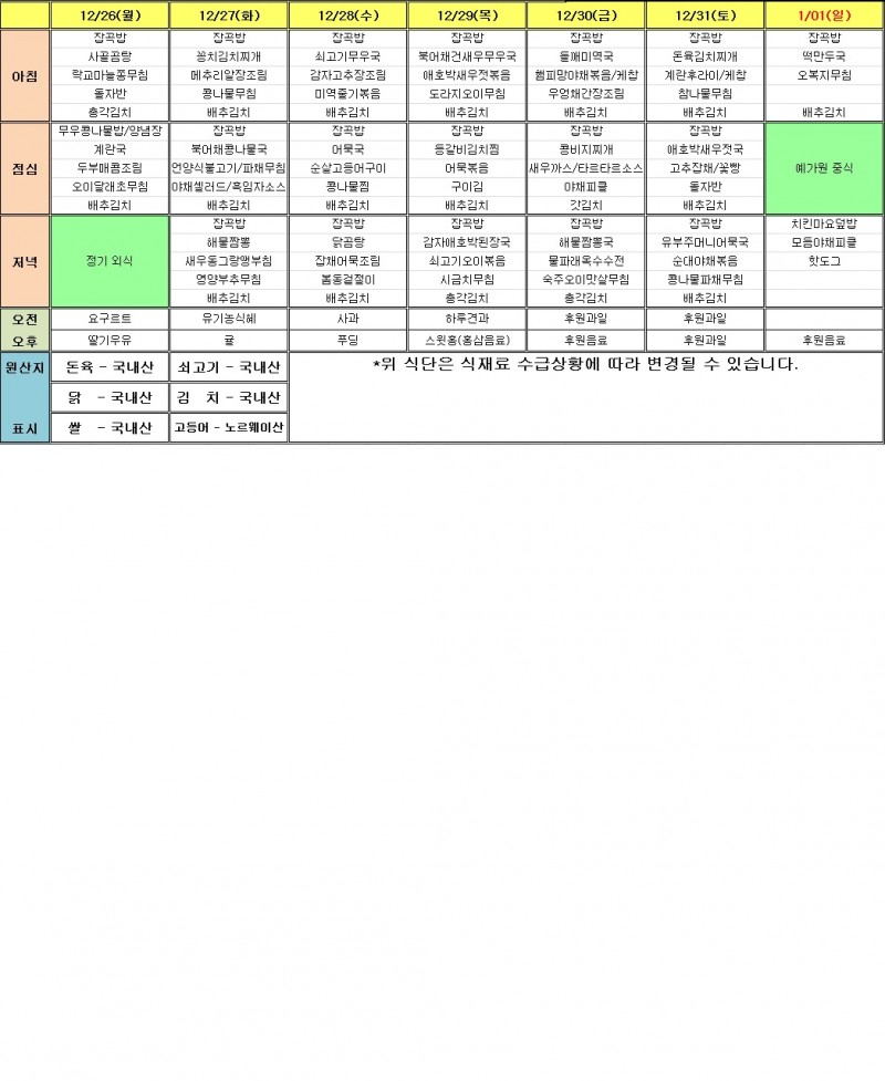 12월 마지막주 식단표