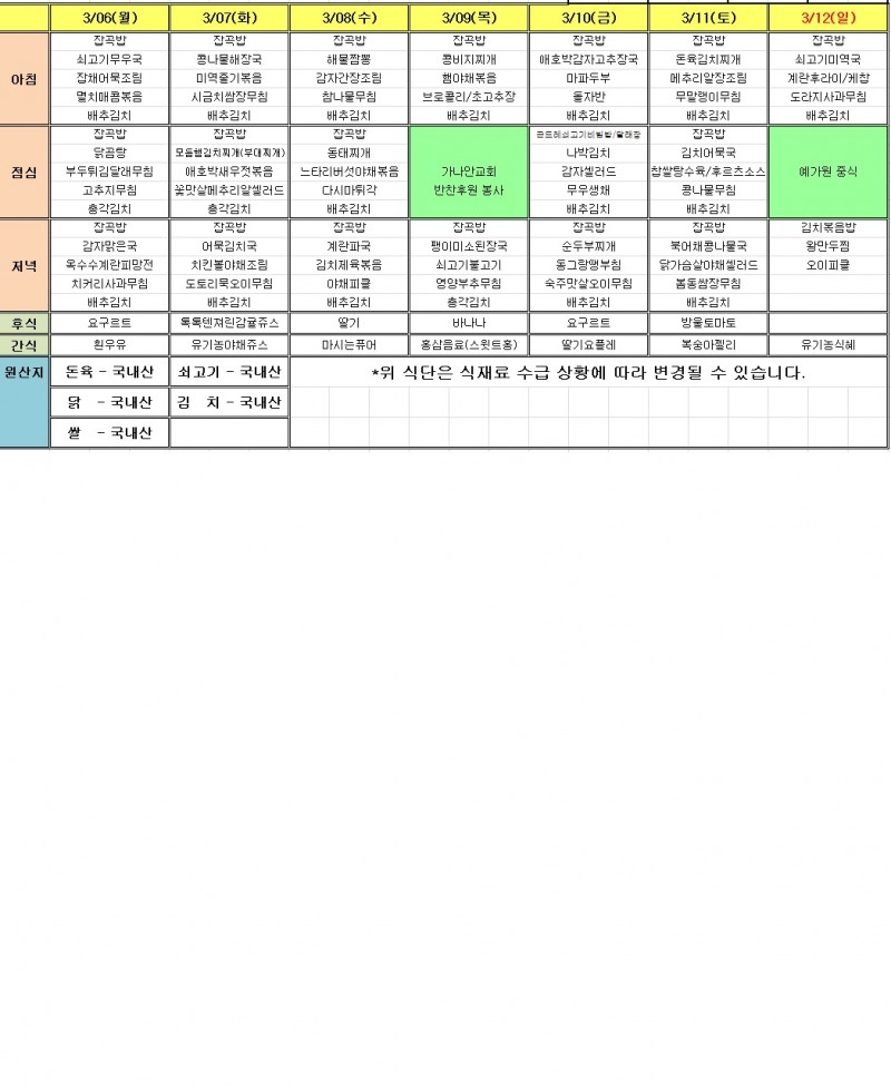 2017년 3월 1주 식단표