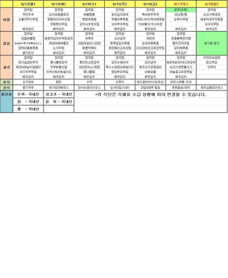 6월 3주 식단표