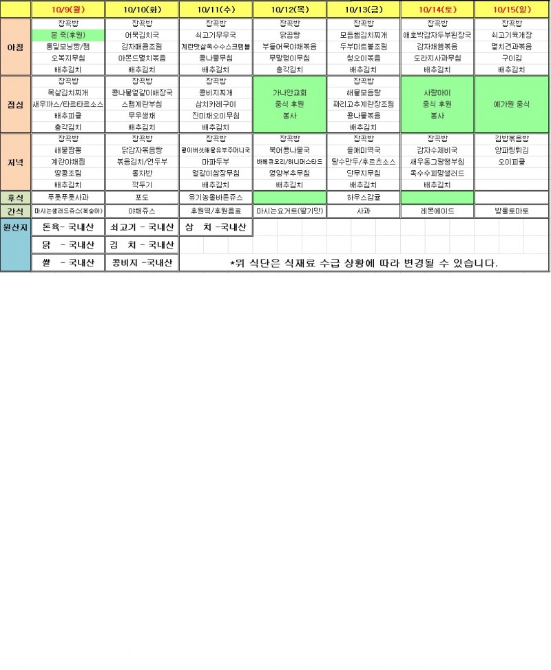 2017년 10월 2주 식단표