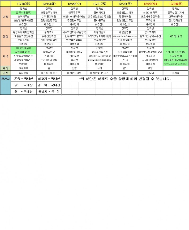 2017년 12월 3주 식단표