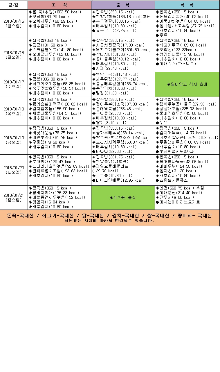 2018년 1월 3주 식단표