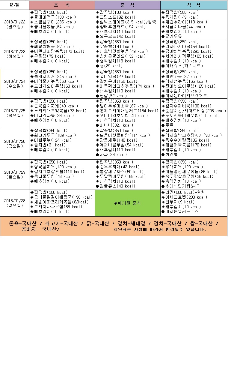 2018년 1월 3주 식단표