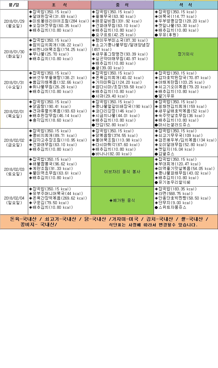 2018년 2월 1주 식단표