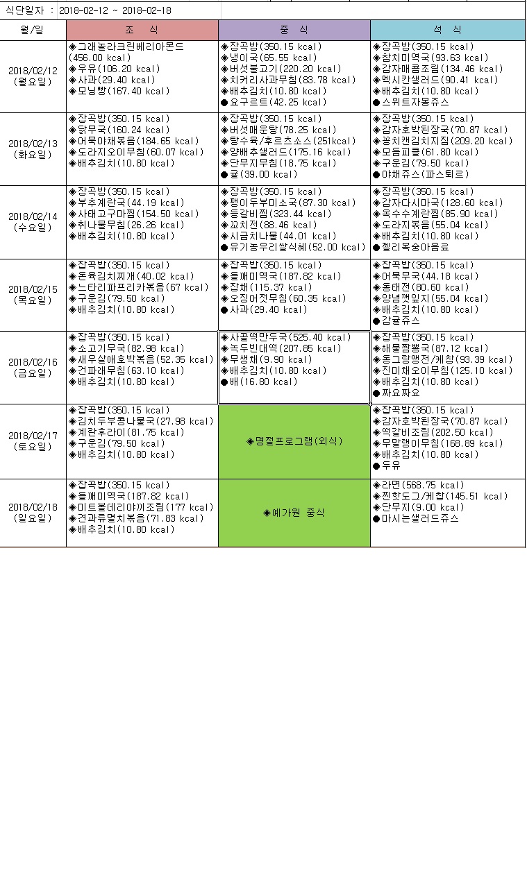 2018년 2월 3주 식단표