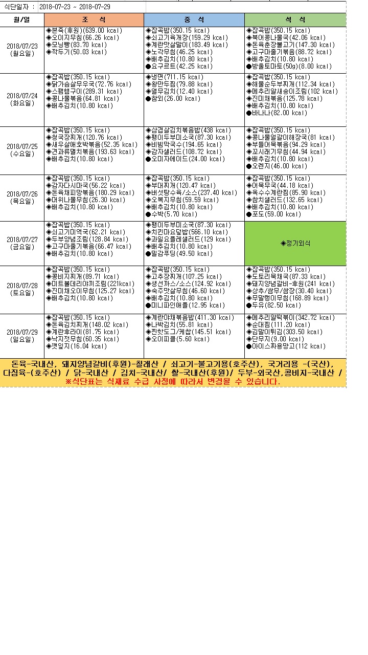2018년 7월 4주 식단표