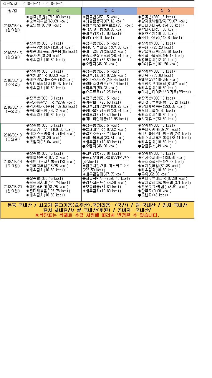 2018년 5월 3주 식단표