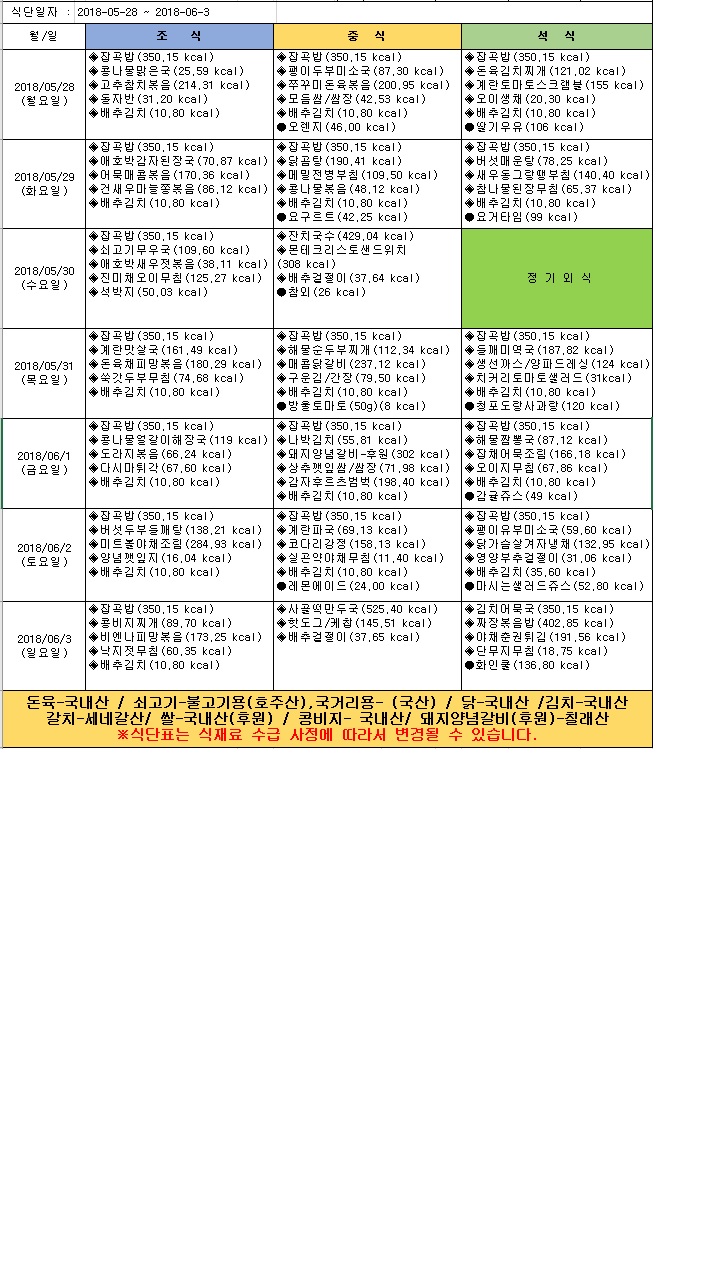 2018년 6월 1주 식단표