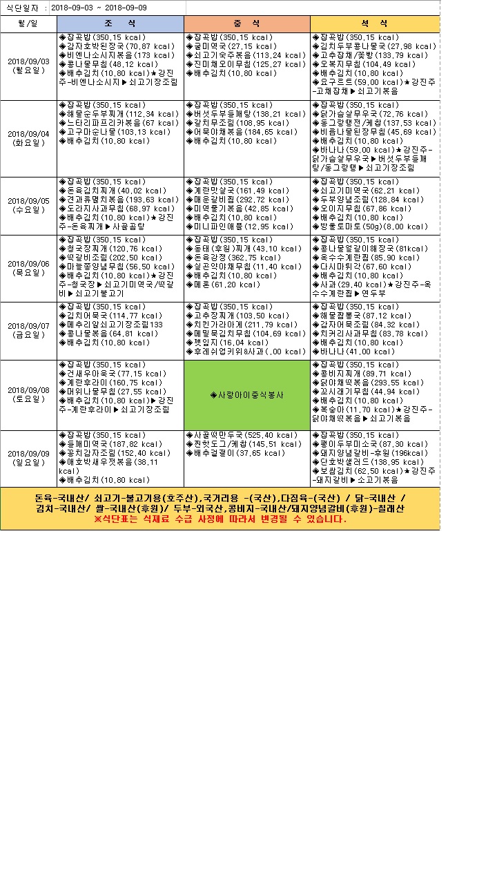 2018년 9월 1주 식단표
