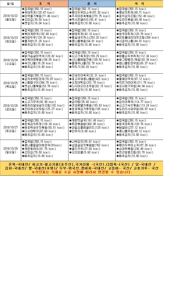 2018년 10월 3주 식단표