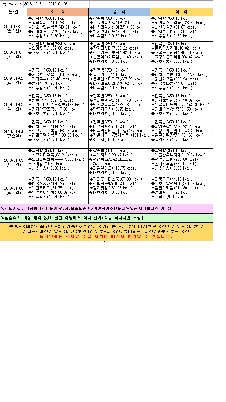2019년 1월 1주 식단표