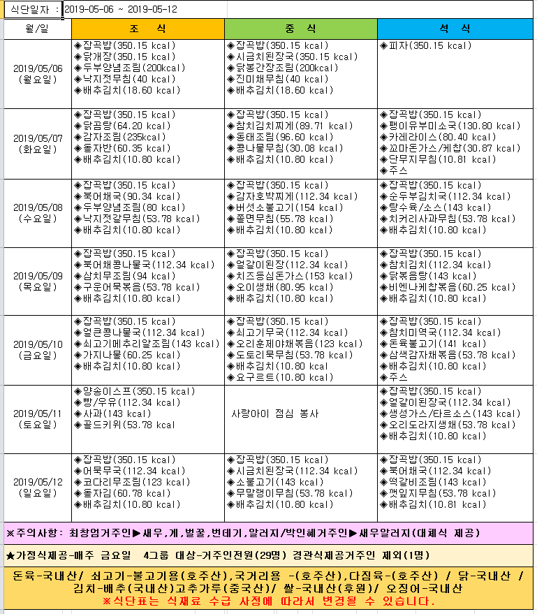*2019년 5월 6일~5월 12일 식단표*