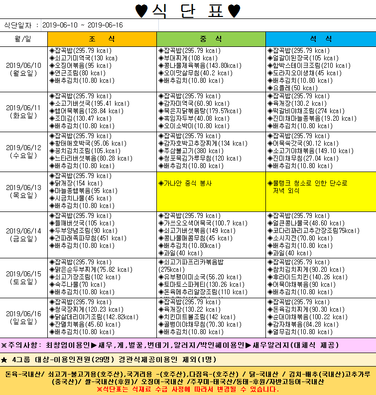 *2019년 6월 10일~6월 16일 식단표*