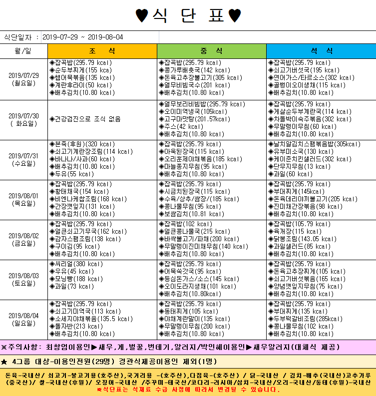 *2019년 7월 29일~8월 4일 주간식단표*