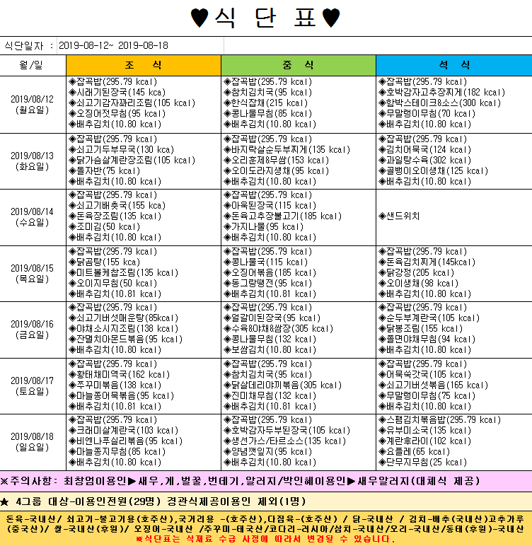 *2019년 8월 12일~8월 18일 주간식단표*