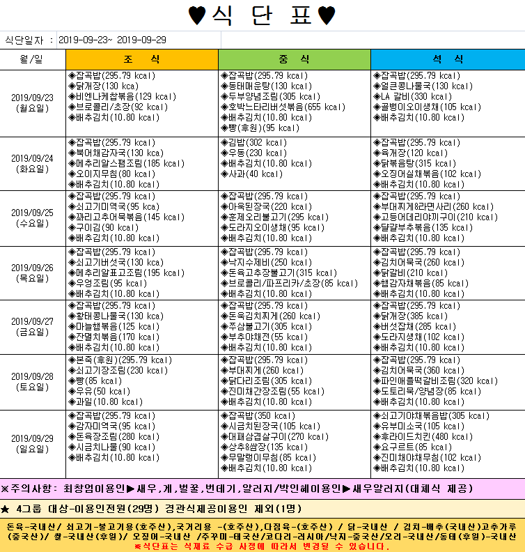 *2019년 9월 28일~2019년 10월 6일 식단표*