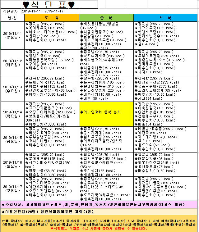 *2019년 11월 4일~11월 10일 식단표*