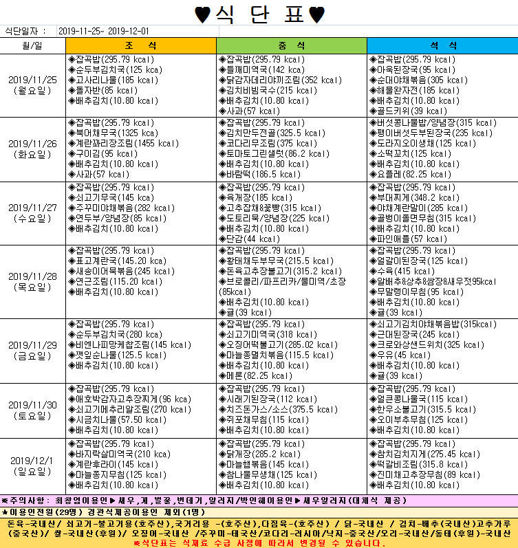 *2019년 11월 25일~12월 1일 식단표*