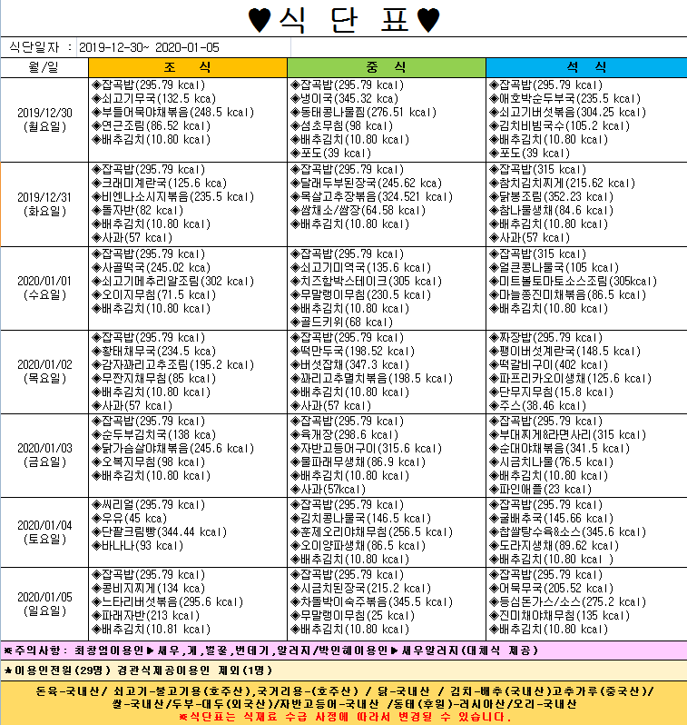 *2019년 12월 30일~2020년 1월 5일 식단표*