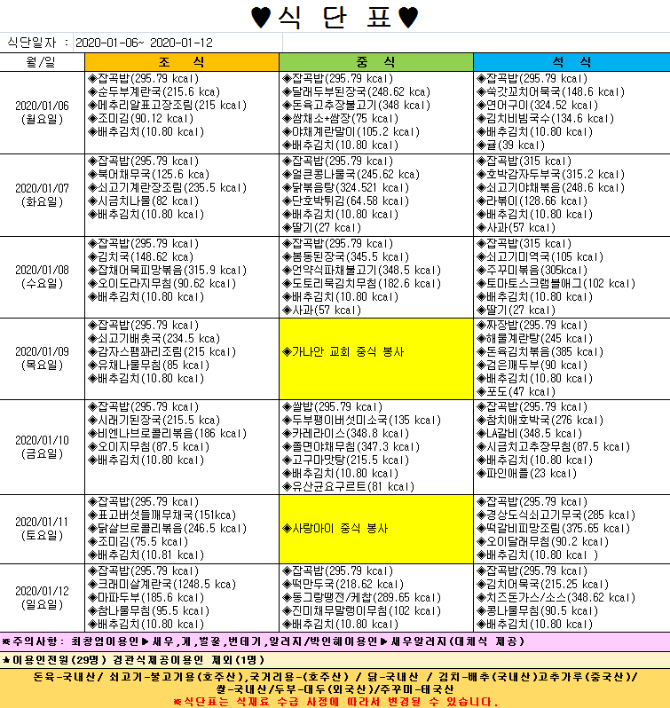*2019년 12월 30일~2020년 1월 5일 식단표*