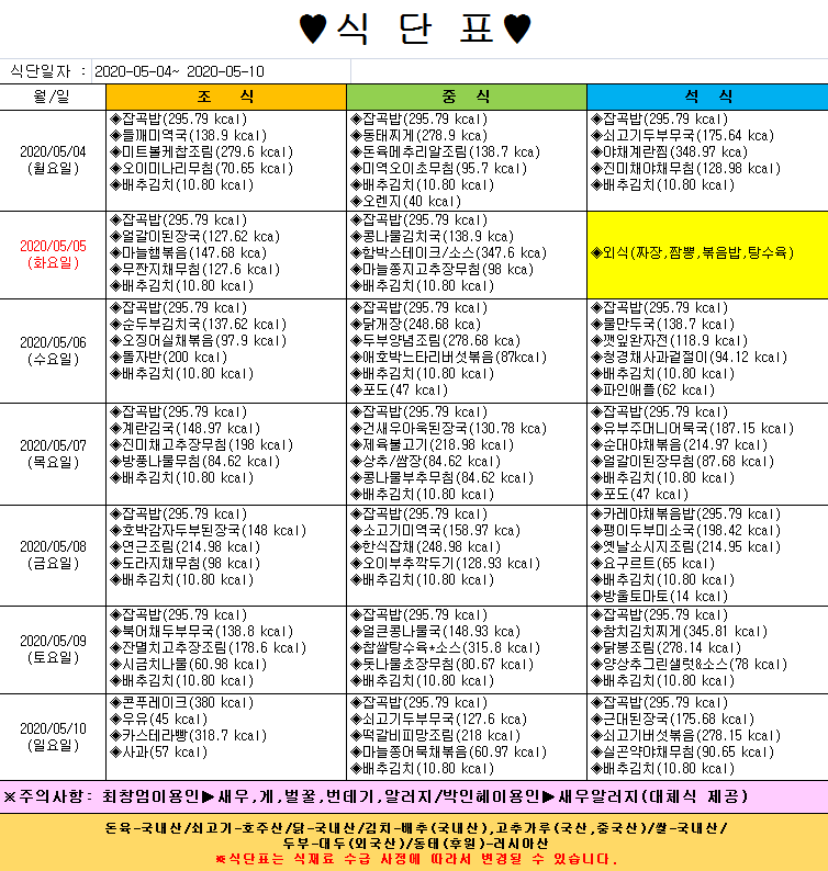 *2020년 5월4일~5월 10일 식단표*