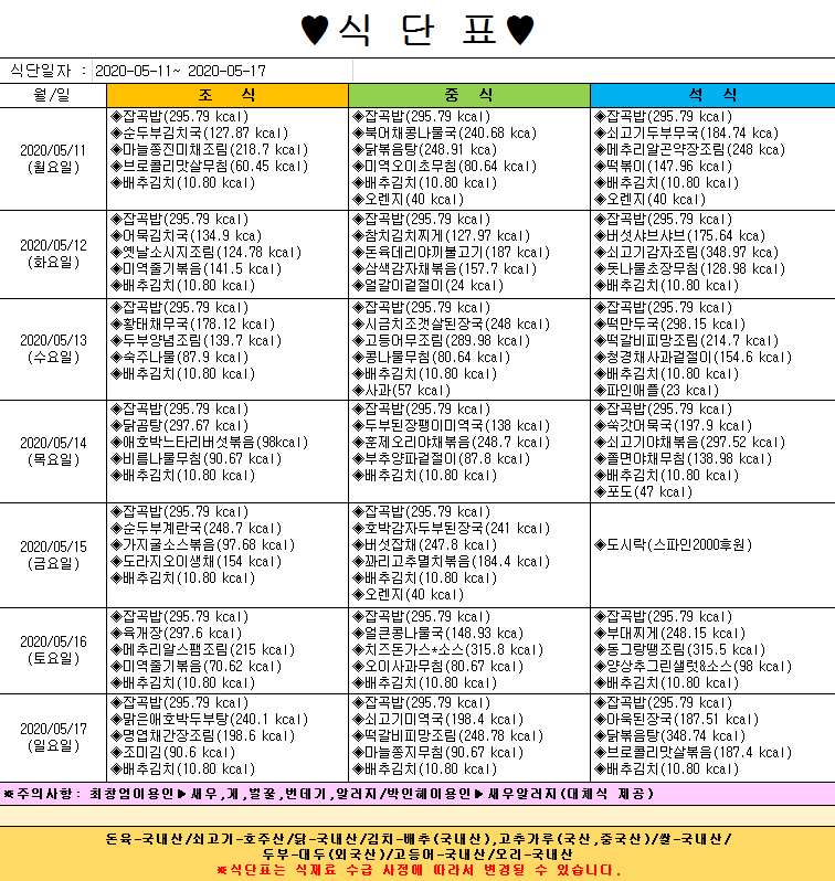 *2020년 5월 11일 ~5월17일 식단표*